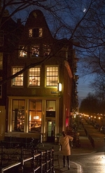 vanavond ben ik verliefd geworden...niet op een mens, maar op een stad. mijn eigen stad. mijn mooi amsterdam. eerst een ontzettend gezellig etentje met broertje in een jordaans eetcaf?...we praatten over zijn verbroken relatie van jaren en jaren en over de mijne...zijn hartstochtelijke verloren liefde en de mijne...over mijn nieuwe leven, zijn plannen om na 15 jaar juristerij toch maar de advocatuur in te gaan...onze hervonden vrijheid, onze lust for life. 'je ziet er steeds jonger uit', sprak hij waarderend. hij mag er ook zijn, mijn knappe broer, met de ogen van onze vader, maar dan liever en warmer. daarna nog een drankje of 2 in een caf? op de noordermarkt, mij speciaal aanbevolen omdat er leuke foute mannen komen...dat viel tegen. ik had alleen ogen voor de prachtige noorderkerk die daar zo mooi torenloos in het donker stond..de prachtige weerspiegeling van lantarens in de donkere prinsengracht. het begon een beetje te regenen. de klinkers werden weemoedig zwart en glimmend. een knappe, lange man die al een tijdje oogcontact zocht, boog zich iets te dicht naar mijn gezicht. 'wacht je op de prins op het witte paard?'vroeg hij. mijn mond opende zich om te vragen waar hij zijn paard had vastgebonden, maar ik keek in een paar jongensogen en zei: 'nee hoor...ik mijmer maar wat'. later, toen ik wegliep, haalde hij mij in op de gracht..'niks aan, he?'zei hij 'ga je mee nog wat drinken?' maar ik was inmiddels zo hopeloos verliefd geraakt op mijn stad, dat ik zijn aanbod vriendelijk afsloeg. ik dook een caf? in, ??n van de laatste bruine kroegen van amsterdam, waar alles nog nep is. nep antiek aan de muren, roodfluwelen gordijnen voor de deur, met ingezette leren stukken...nep delfstblauwe tegeltjes met een nepkachel ervoor...kale houten tafels en stoelen met nepleren zittingen...ik zat bij de ingang zodat ik de mooie keizersgracht kon overzien. de statige koopmanshuizen, de glimmende bruggen. ik wilde mijn tanden wel zetten in de ijzeren leuningen, hun metalen smaak oplikken, zoals ik deed als kind, wanneer ik naar balletles liep. 3 stelletjes kwamen binnen, mannen met hun rechtmatige eigenaressen..alle drie de mannen keken naar mij, te lang en te intens..maar ik keek weg. been there...done that...got the t-shirt. ik wilde naar buiten, de ongelijke klinkers voelen onder de dunne zolen van mijn hooggehakte sandaaltjes. ik liep en liep de prinsengracht...kwam bij de egelantiersgracht waar mijn opa een half leven had gewoond. waar ik als puber en jongvolwassene op visite ging, om dan te worden toegelaten in het heilige der heiligen, zijn werkkamer. tussen de 8000 boeken hing daar aan een punaise mijn portret. iedere keer als ik er kwam, stak mijn opa daar de loftrompet over. 'iedereen die hier komt, vraagt me wie dat is...en dan zeg ik: dat is mijn knappe kleindochter'. mijn opa, die geen opa was, maar een groot schrijver, was dan toch even een opa. hij stierf dit jaar, in januari, 97 jaar oud. ik sta voor de oeroude ijzerwarenwinkel van van gunters & meuser, met de art-d?co letters op de gevel. roerloos sta ik even op de brug, voel de schoonheid van de stille gracht en steek mijn zoveelste gauloise brune op. ineens besef ik dat 20 stappen verder het caf? is waar ik aanvankelijk mijn laatste geliefde zou ontmoeten...de afspraak werd verzet naar een caf? bij mij in de buurt en daarna brutaalweg bij mij thuis. ik loop het caf? in, een caf? zonder muziek. ik drink er mijn drankje, flirt wat met een paar aardige mannen en wil dan toch weer naar buiten. op het moment dat ik op de natte klinkers stap, klinkt het prachtig carillon van de westerkerk. ik sta stil op de brug van de bloemgracht en huil een beetje om zoveel moois. wat ben je mooi, wat ben je lief, mijn amsterdam...wat ben je wijds en toch intiem. hoe kan iemand niet van je houden? en hoe heerlijk is het, een vrije meid te zijn in een stad als amsterdam...