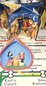 Christmas came early to Earl's Court this year, with a giant teardrop-shaped meteor landing just outside the north entrance to the Victoria Line tube station. An egg-like cracking open, to the sound of a choir of angels singing Hallelujah, revealed inside a starry sky backdrop to a scene of Mary, Joseph and baby Jesus being nuzzled by a pair of legless space deer.